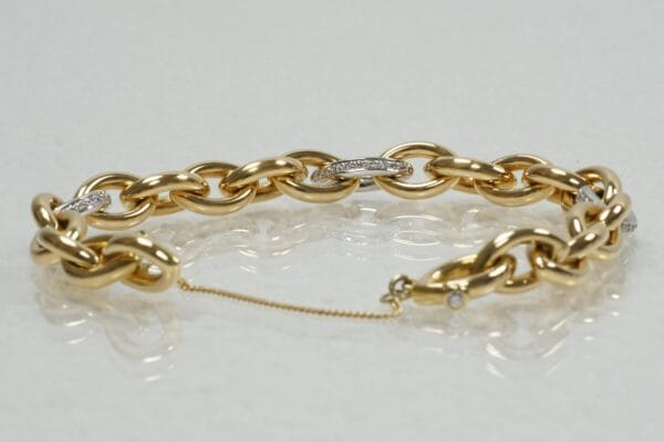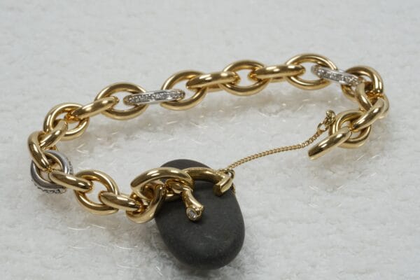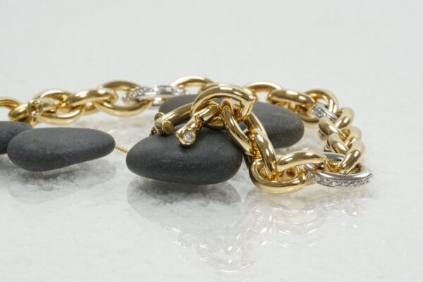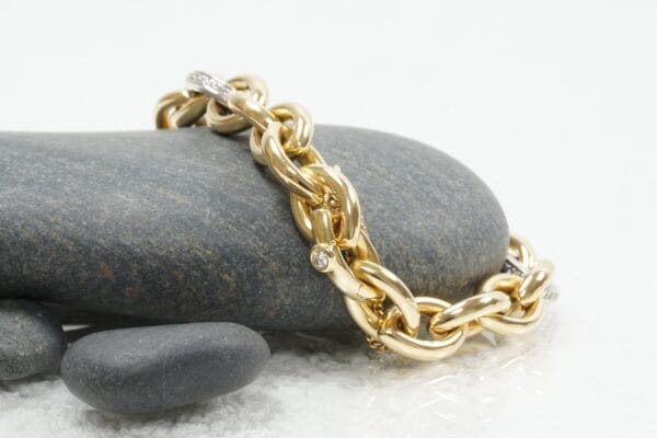 Mooie massieve schakelarmband in 18 kt. geel en witgoud.