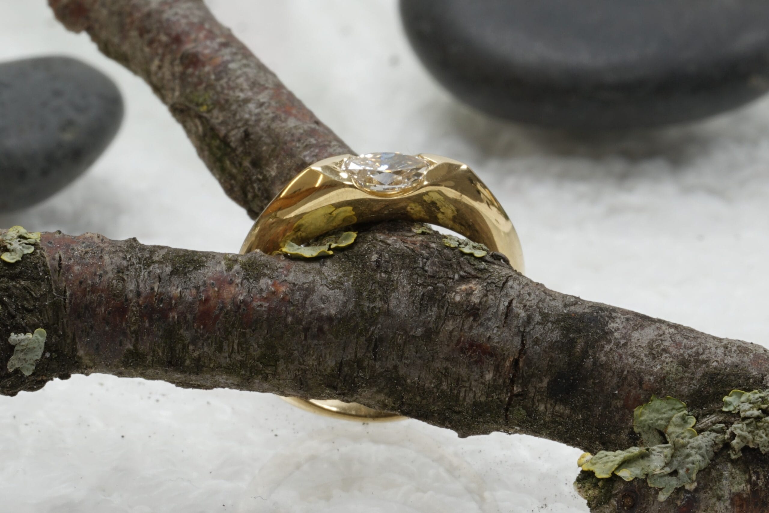 van oud goud en een marquis geslepen natuurlijke diamant van de klant, een nieuwe ring vervaardigd in eigen atelier.