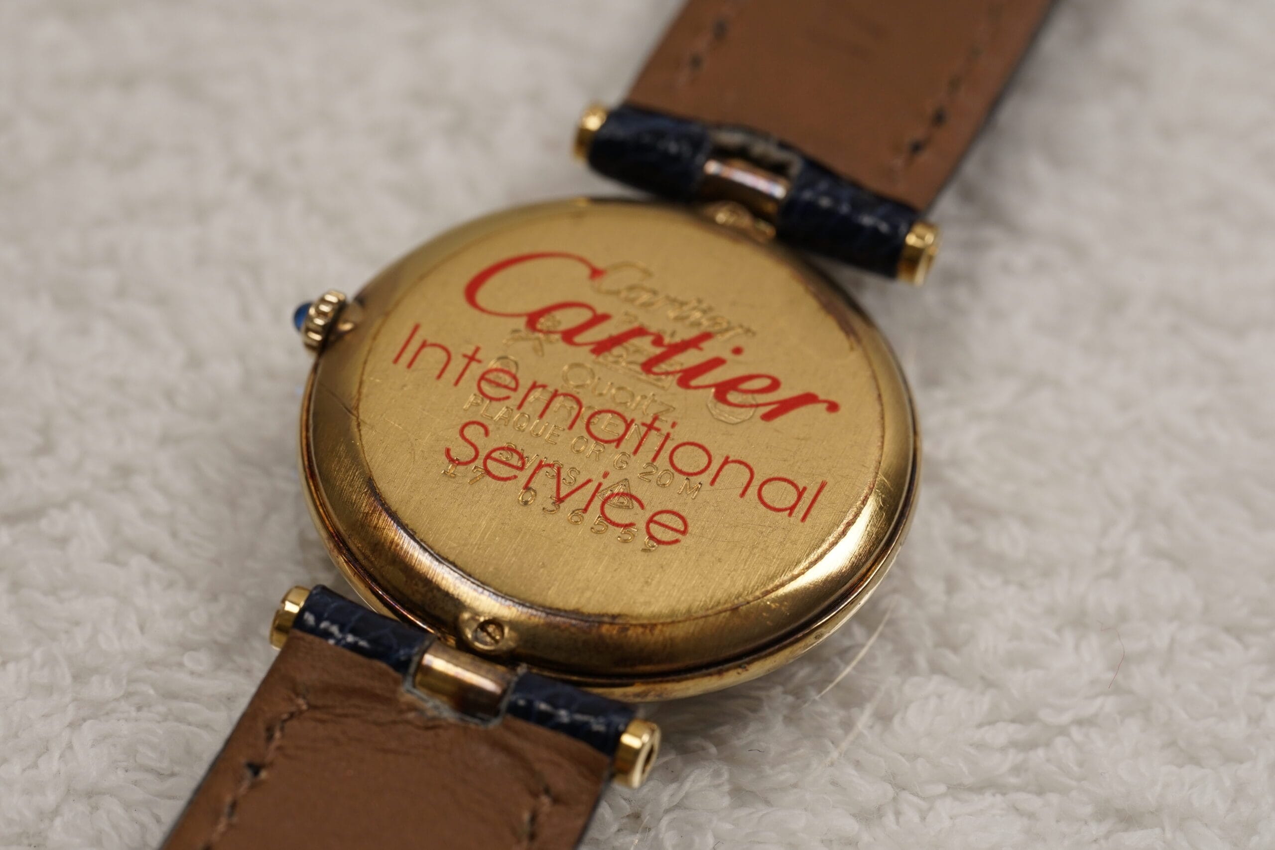 Een mooi en origineel Must de Cartier dameshorloge met een donkerblauwe lapis wijzerplaat.