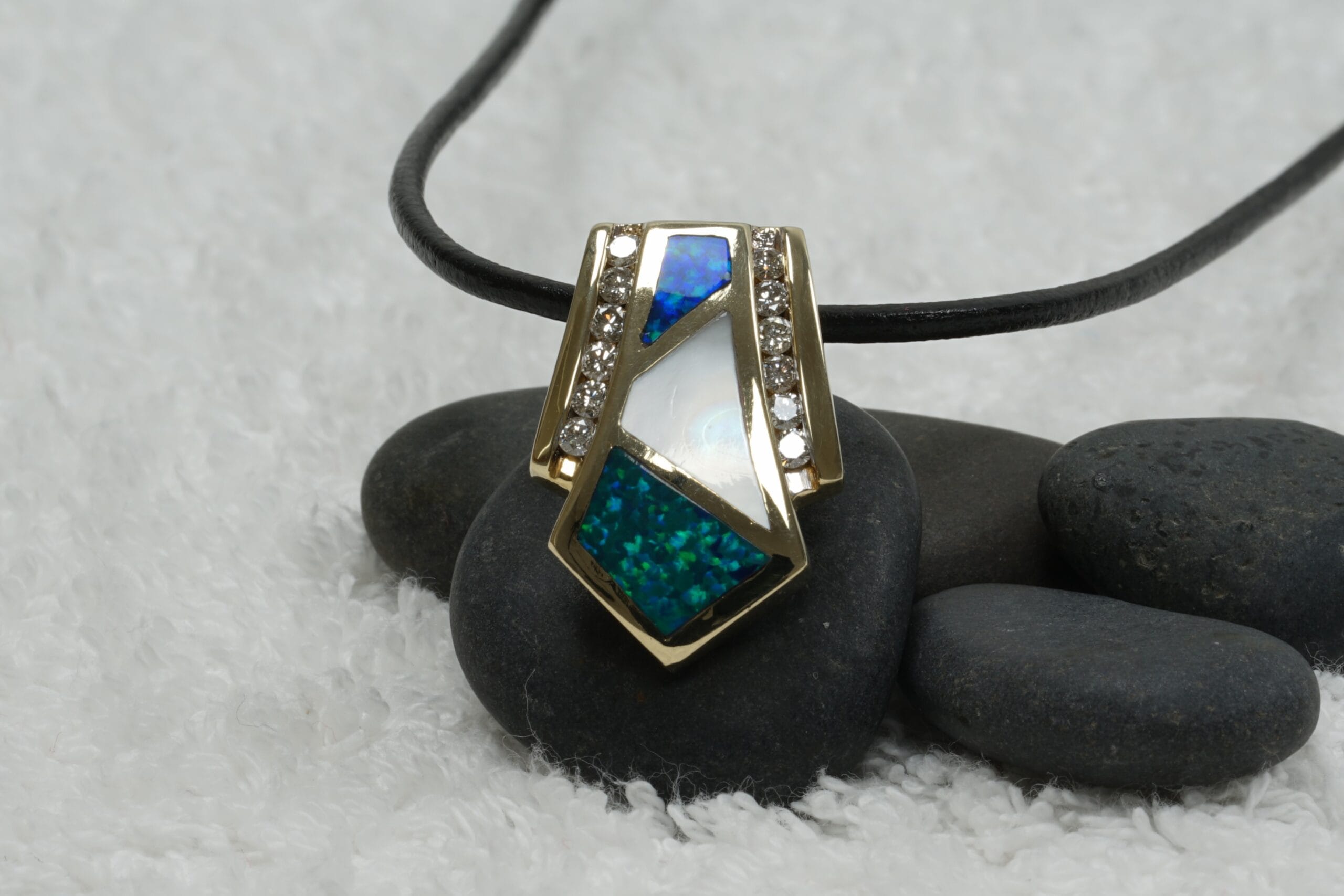 14 kt. geelgouden hanger bezet met opaal, mother of pearl en 0,36 ct. FG-Si natuurlijke diamant briljant geslepen.
