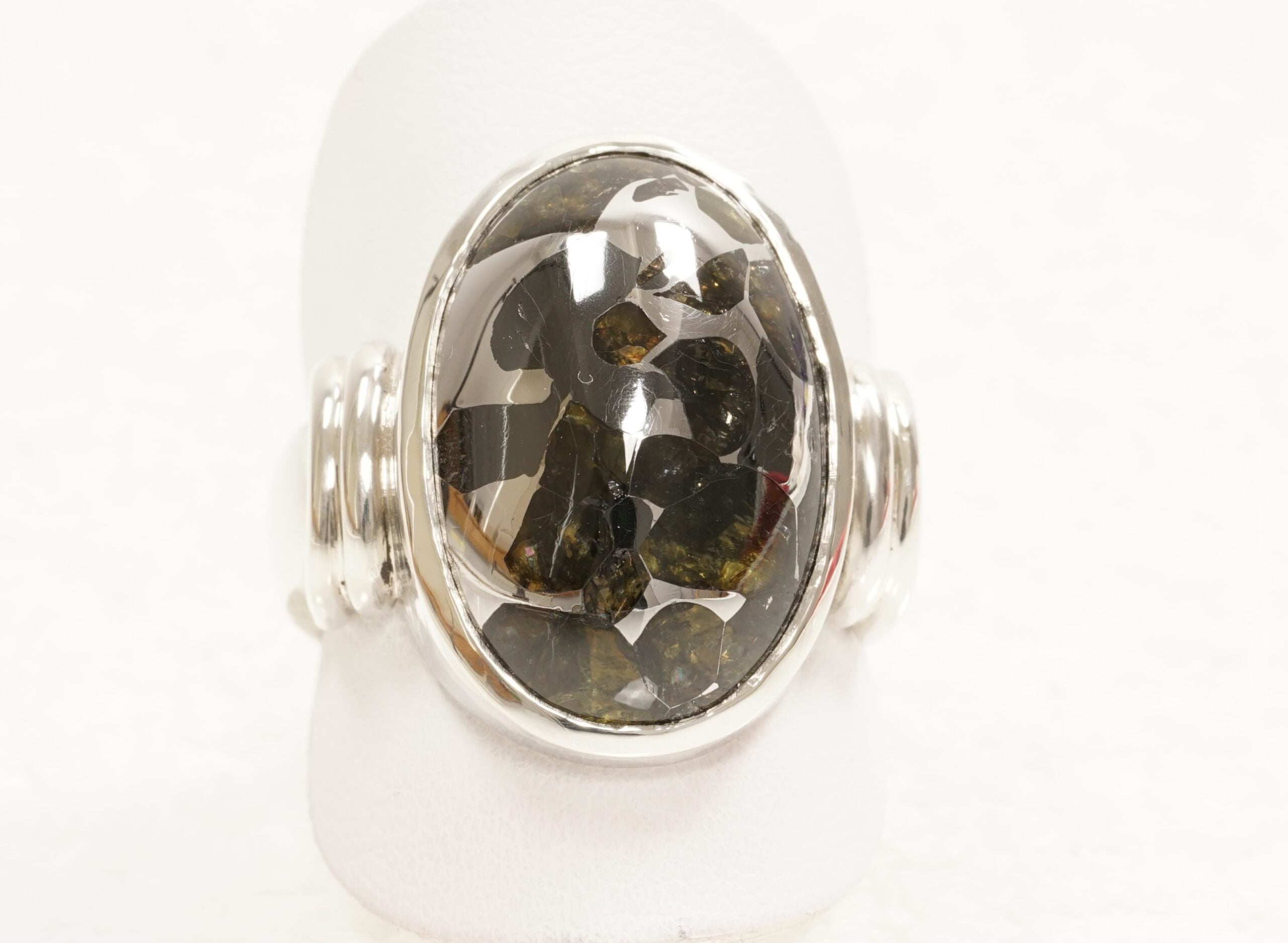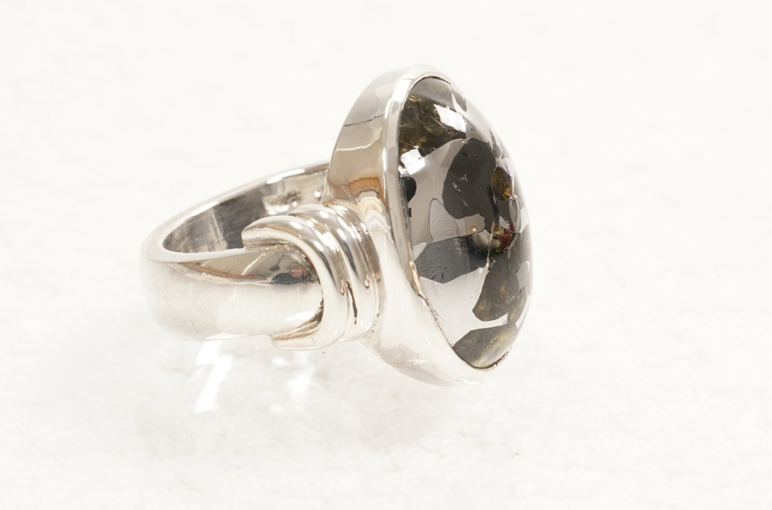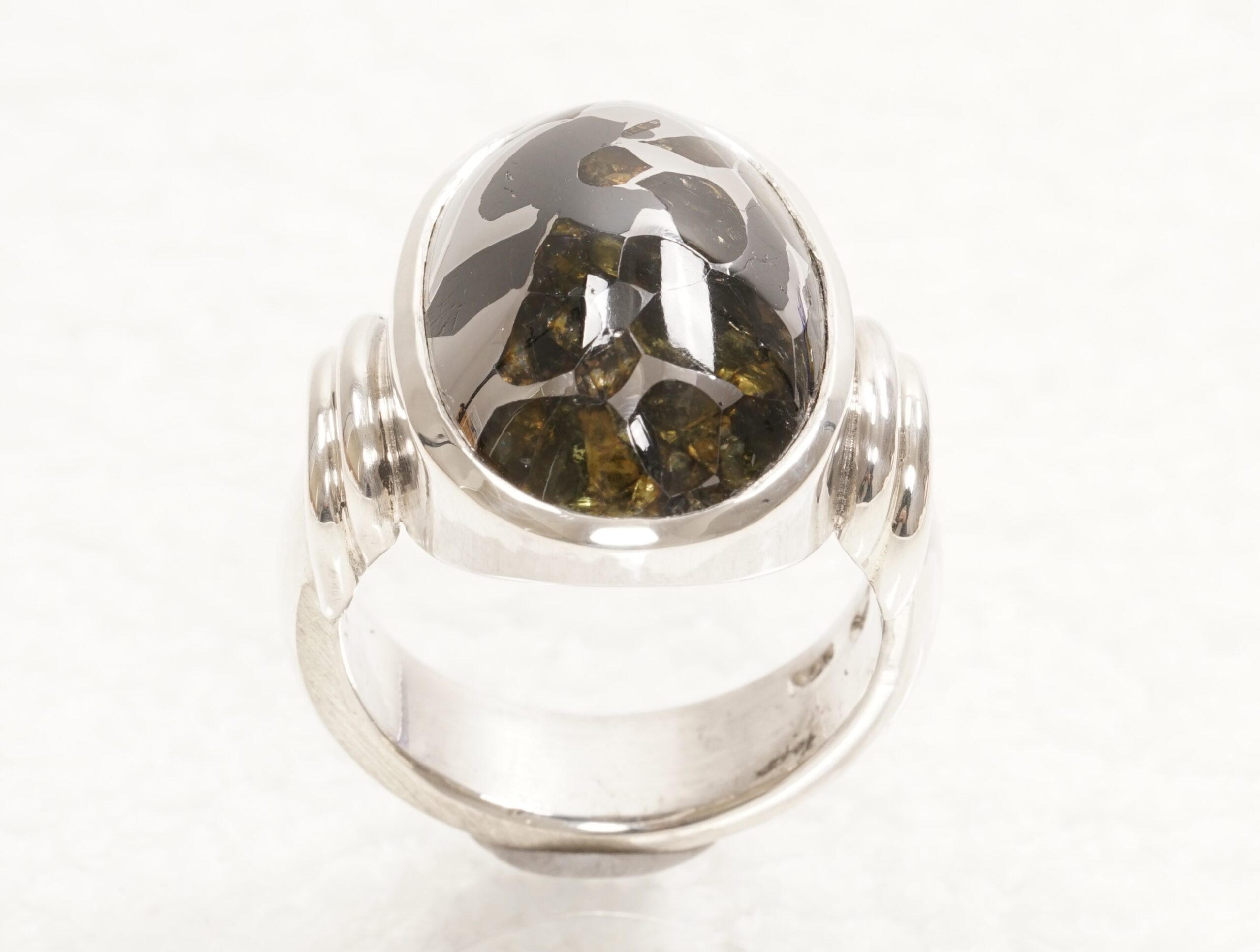 Deze bijpassende zilveren ring voor deze prachtige meteoriet is samen met de klant ontworpen en vervaardigd in eigen atelier.
