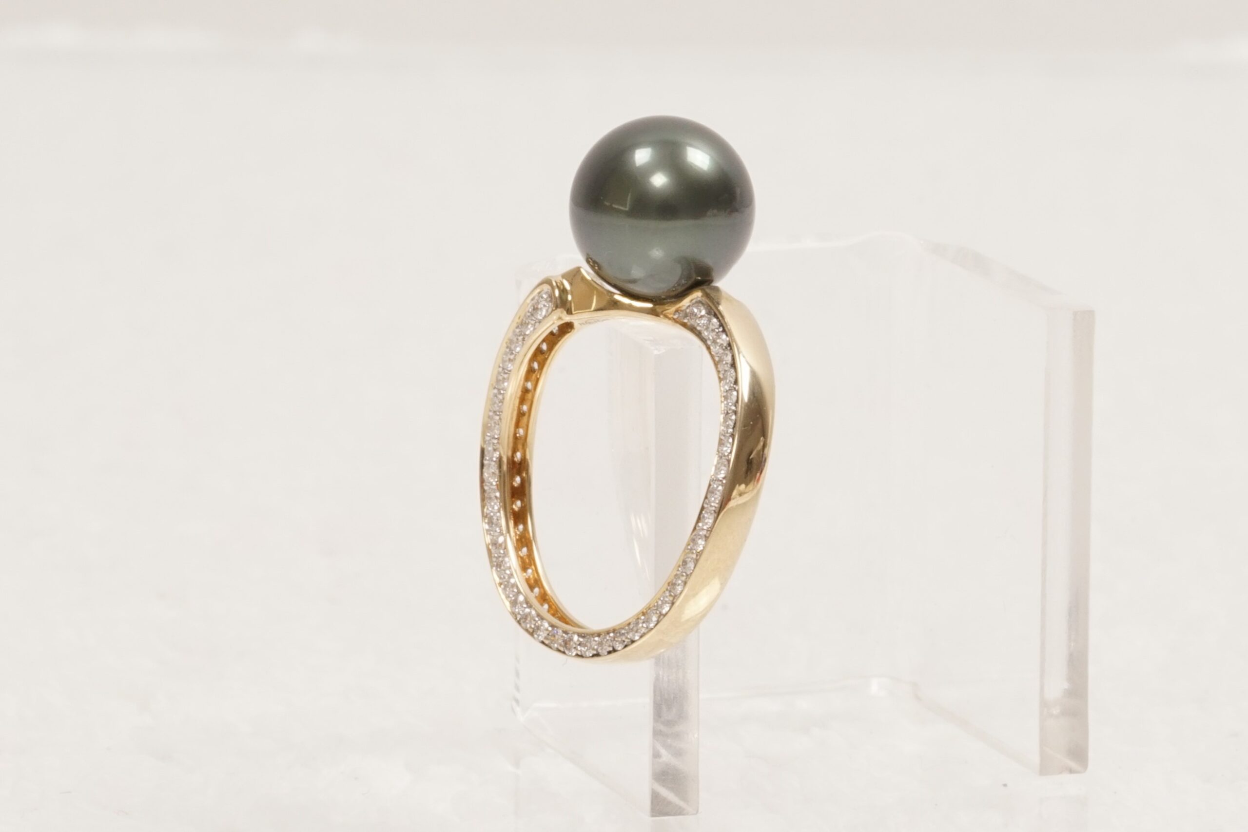 Tahiti parelring. De 10 mm. tahitiparel is geplaatst in een 14 kt geelgouden slagring. De ring is aan de zijkanten bezet met 78 briljant geslepen diamanten FG-Si1. Totaal ca. 0,60 ct. Ringmaat 17. Deze ring kan niet van maat veranderd worden.