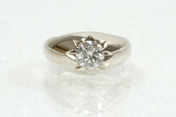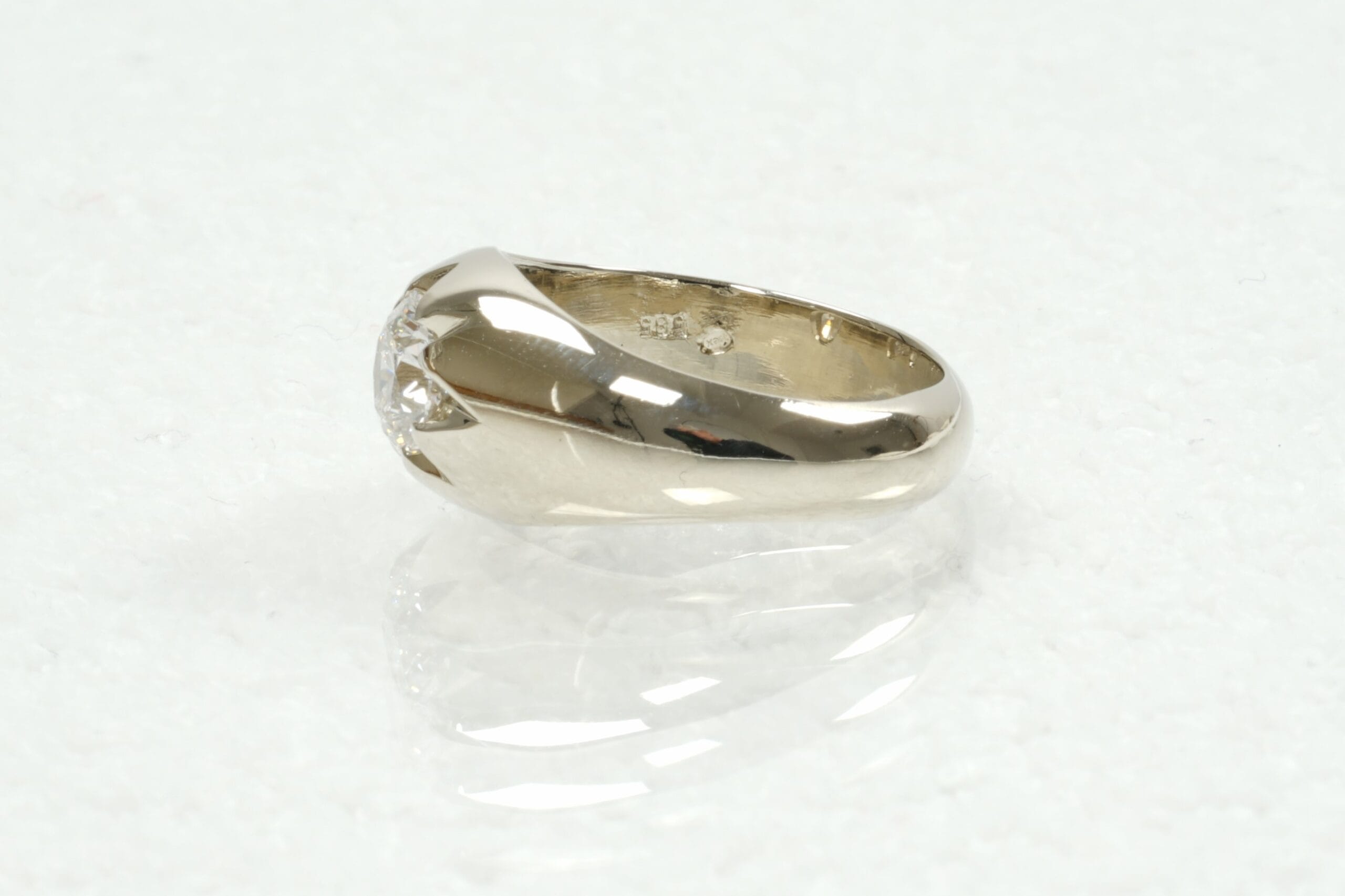 Van 14 kt. witgoud en een labgrown diamant van de klant een herenring vervaardigd in eigen atelier.