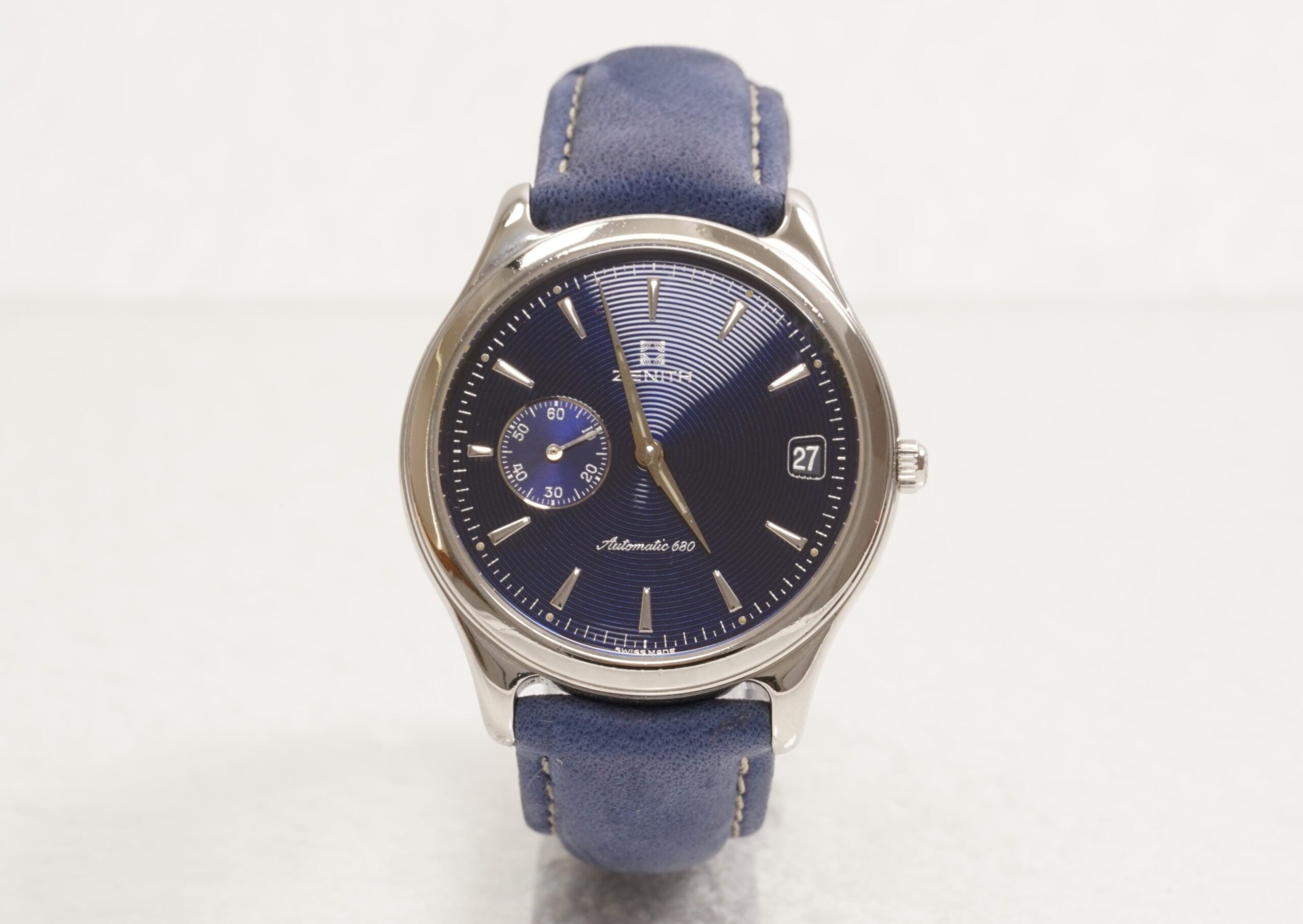 Merk: Zenith Model: Elite 680 Opwinden: automatisch Materiaal horlogekast: staal Staat: zeer goed Diameter horlogekast: 36 mm Glas: saffierglas Wijzerplaat: blauw Bouwjaar: onbekend Zonder originele doos zonder papieren